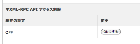 この二つがあるので今回は「▼XML-RPC API アクセス制限」の方だけ一時的にOFFにXML-RPC- API
