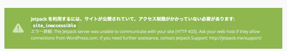 Jetpack を利用するには、サイトが公開されていて、アクセス制限がかかっていない必要があります: site_inaccessible